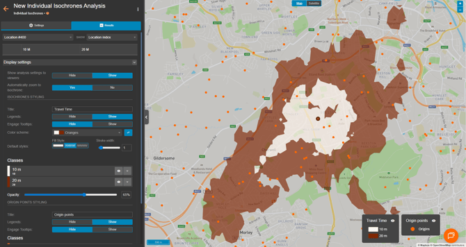 Just like for the isochrone analysis, the results page displays calculations of any dataset queries constructed during setup. The legend on your map indicates which colours relate to which duration contour and the isochrones themselves depict the areas that can be reached to or from each individual location in the displayed timeframes.